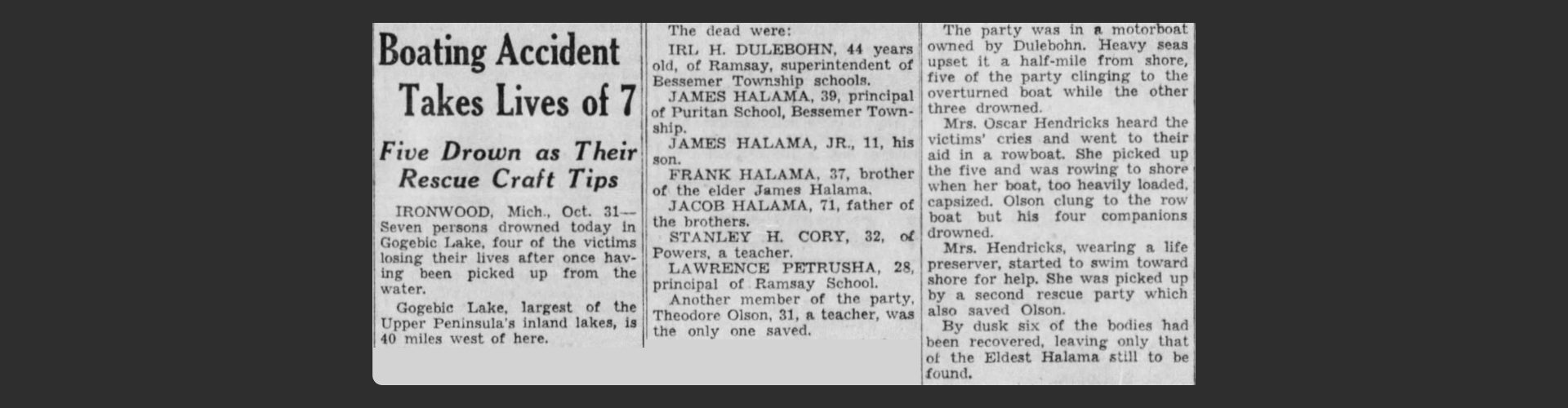 On October 31, 1936, on the shores of Lake Gogebic in northern Michigan, what began as a day out on the water turned into a heartbreaking tragedy. A motorboat carrying seven men and a 12-year-old boy capsized in deep water roughly 600 feet from shore. The waves were about two feet high, the water cold, and the boat overturned in water some 20 feet deep. One by one, the men and boy struggled to hold on to the overturned hull. Two men drowned while swimming toward shore, and a third lost his grip and was pulled under when the boat drifted toward land.
